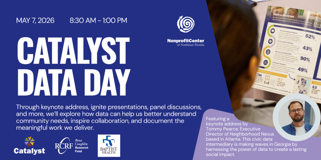 Join us for Northeast Florida’s first Data Day. This half-day gathering is designed to spark ideas, build skills, and strengthen connections across our community. Whether you’re just beginning your data journey or have years of experience, this event offers opportunities to learn, share, and grow together. Through keynote sessions, ignite presentations, panel discussions, and more, we’ll explore how data can help us better understand community needs, inspire collaboration, and document the meaningful work we deliver.